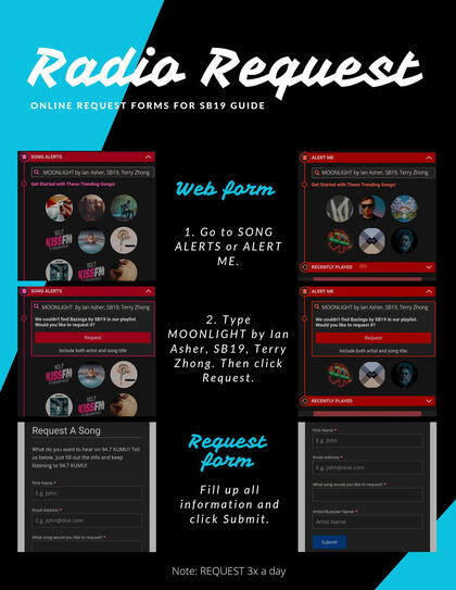 Radio request via online form. Click on the links and request 'MOONLIGHT' by Ian Asher, SB19, Terry Zhong 3x a day.